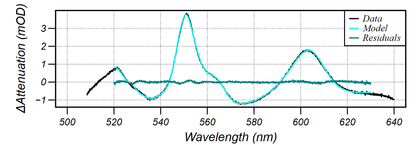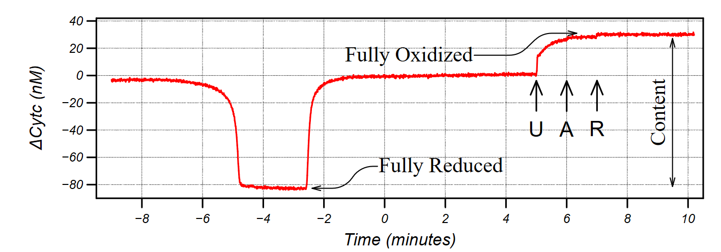 The Iberius uses absorption spectroscopy to measure changes in heme oxidation state from baseline in units of nanomolar. We use anoxic conditions to fully reduce the hemes and mitochondrial inhibitors to fully oxidize the hemes allowing the content of the hemes, and hence the respiratory complex, to be calculated and the oxidation state (percent oxidized) and redox potential to be calculated.