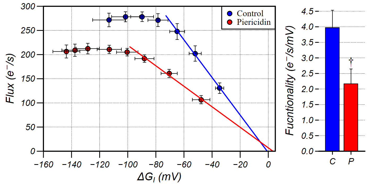 At equilibrium (ΔG=0), the net flux through complex I is zero. The flux increases linearly with ΔG as complex I is driven away from equilibrium and then saturates far from equilbrium. The functionality is the slope of the force (ΔG)-flux relationship. If complex I is operating with high functionality then the complex needs to be displaced from equilibrium by a small mount to achieve high electron transfer and proton pumping. A post translational modification, such as a signalling phosphorylation, would be expected to change the functionality.