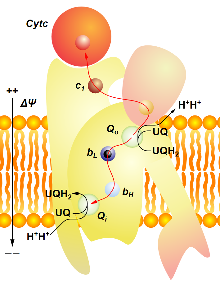 operates via the modified Q-cycle in which ubiquinol (UQH2) is oxidized at the Qo centre on the cytosolic side of the membrane. The two protons are released into the intermembrane space and the first electron is passed to the high potential chain consisting of an iron-sulphur centre (FeS) in the iron sulphur protein and heme